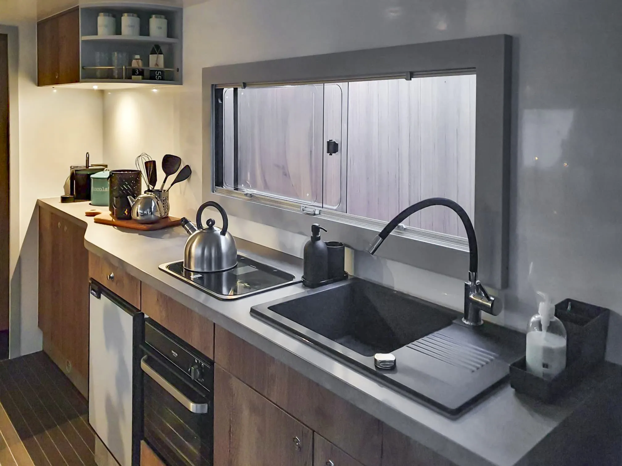 Houten glazen schuifdeur naar terras, Dometic schuiframen 4x met verduistering gordijn en muggenhor, HPL teak vinyl vloer verlijmd, salon met dinette en neerlaatbare tafel voor bedombouw (1.40 × 2.00 m), inbouwkasten met opbergvakken en wandplanken in keuken – salon en slaapkamer, bed in slaapkamer met opbergruimte, afmeting bed 1,40 × 2,00 m.