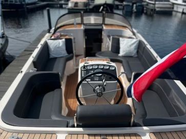 Zodra u het dek betreedt, valt de elegante lijnvoering en het hoogwaardige polyester meteen op. De achterin geplaatste stuurpositie creëert een open, sociale beleving: u stuurt terwijl u midden in het gezelschap blijft, met vrij zicht over het water en het zonnedek. Het gevoel van vrijheid is direct aanwezig — of u nu langzaam door idyllische grachten glijdt of de ruimte pakt op open water.